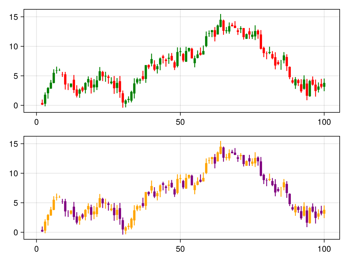 endThen we get to the meat of the recipe, which is actually creating a plot method. We need to overload a specific method of Makie.plot! which as its argument has a subtype of our new StockChart plot type. Its type parameter is a Tuple type of the converted argument types for which this method should work.