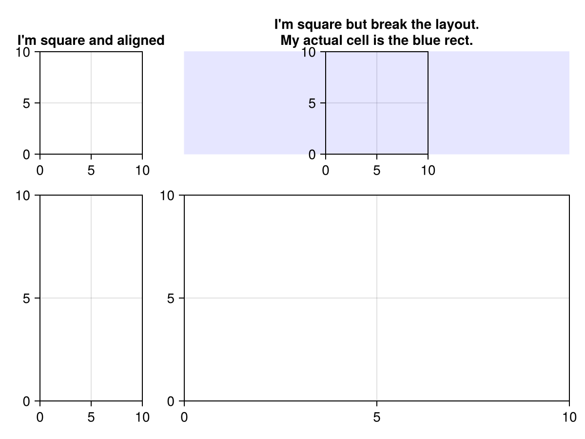 Aspect sized columns or rows are very useful when you want to constrain the aspect ratio of a grid cell. For example, a plot that is always supposed to be square. Enforcing the aspect on the layout level is better than setting axis.aspect = AxisAspect(1) in most cases, because it ensures an intact layout where all grid cell borders are aligned visually. An Axis with aspect = AxisAspect(1) on the other hand simply shrinks so it remains square, but this will break alignment with other grid content.