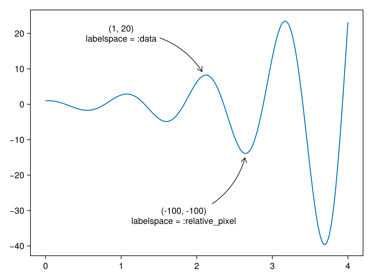The space in which the label positions are given. Can be :relative_pixel (the positions are given in screen space relative to the target data positions) or :data. If a text label should be positioned somewhere close to the labeled point, :relative_pixel is usually easier to get a consistent visual result. If an arrow is supposed to point from one data point to another, :data is the appropriate choice.