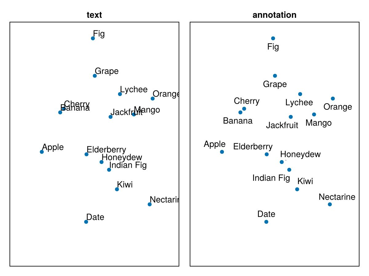 In this example, you can see how the text recipe results in an unreadable overlap for some labels, while annotation pushes labels apart.