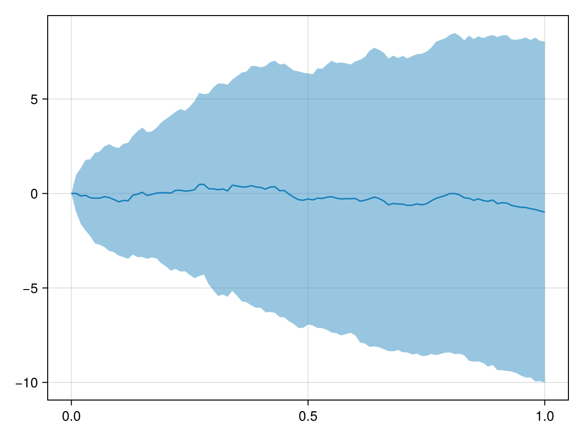 band!(t, μ + σ, μ - σ; alpha=0.5) # plot stddev band