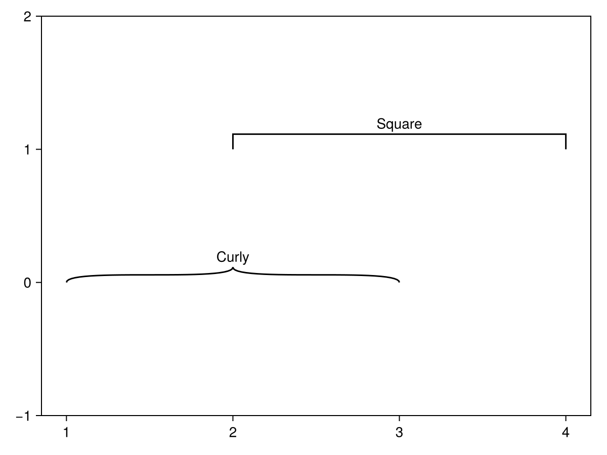 bracket!(ax, 2, 1, 4, 1, text = "Square", style = :square)