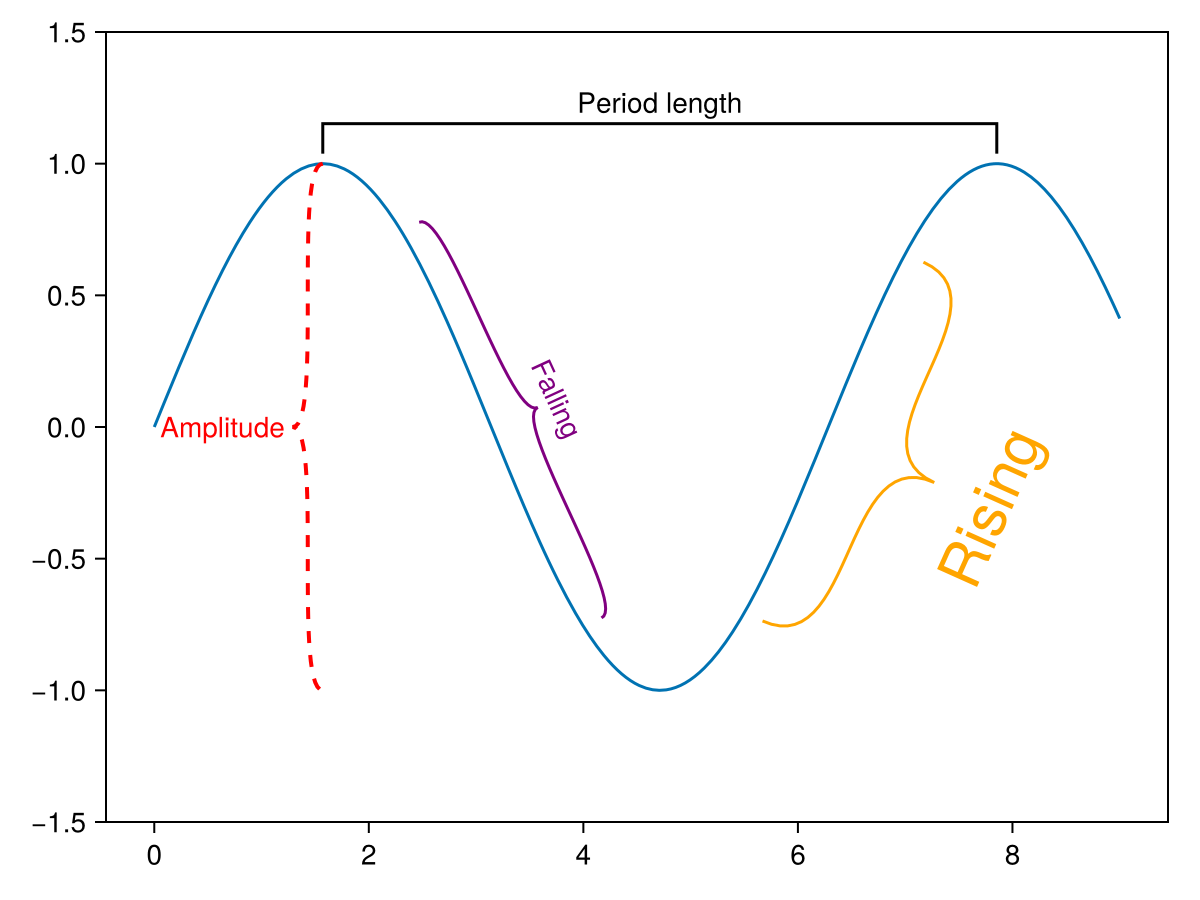 bracket!(pi/2, 1, 5pi/2, 1, offset = 5, text = "Period length", style = :square)