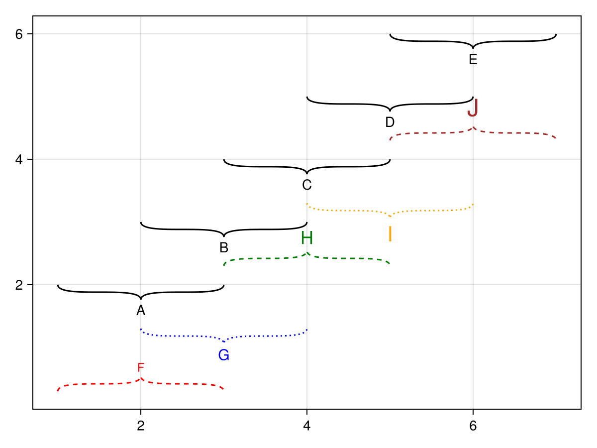 bracket(vec_of_point_tuples; kwargs...)Draws a bracket between each pair of points (x1, y1) and (x2, y2) with a text label at the midpoint.