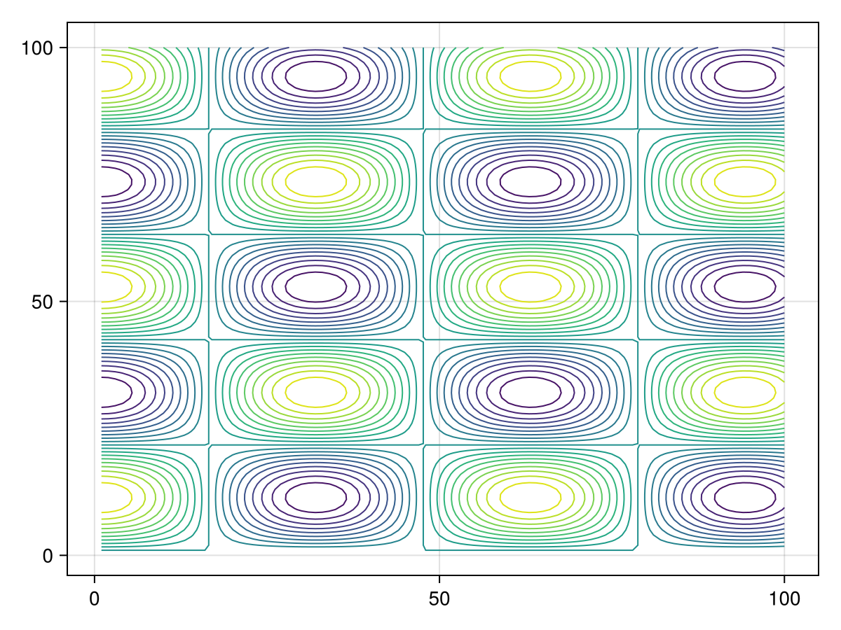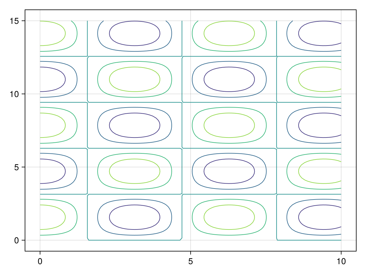 contour(z::Matrix)Creates a contour plot of the plane spanning x::Vector, y::Vector, z::Matrix. If only z::Matrix is supplied, the indices of the elements in z will be used as the x and y locations when plotting the contour.