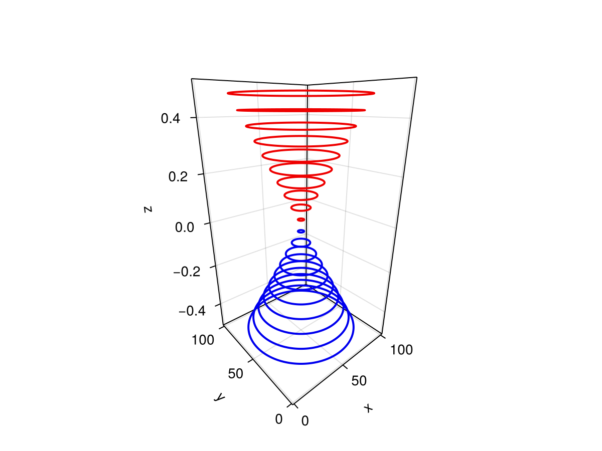 3D contour plots exist in two variants. contour implements a variant showing multiple isosurfaces, i.e. surfaces that sample the same value from a 3D array. contour3d computes the same isolines as a 2D contour plot but renders them in 3D at z values equal to their level.