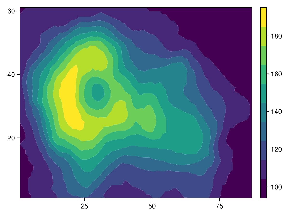 co = contourf!(volcano, levels = 10)
