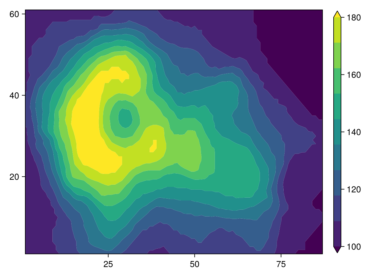 contourf(xs, ys, zs; kwargs...)Plots a filled contour of the height information in zs at horizontal grid positions xs and vertical grid positions ys.