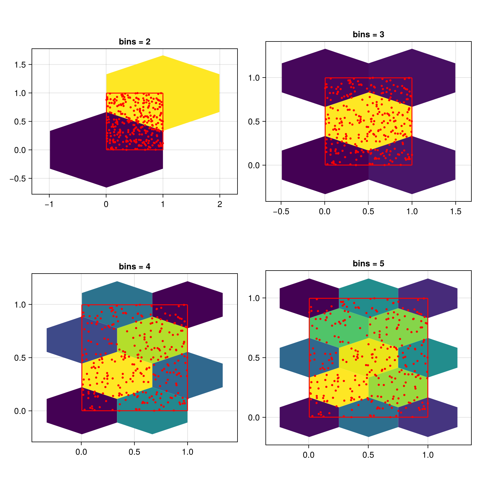ax = Axis(f[fldmod1(i-1, 2)...], title = "bins = $i", aspect = DataAspect())