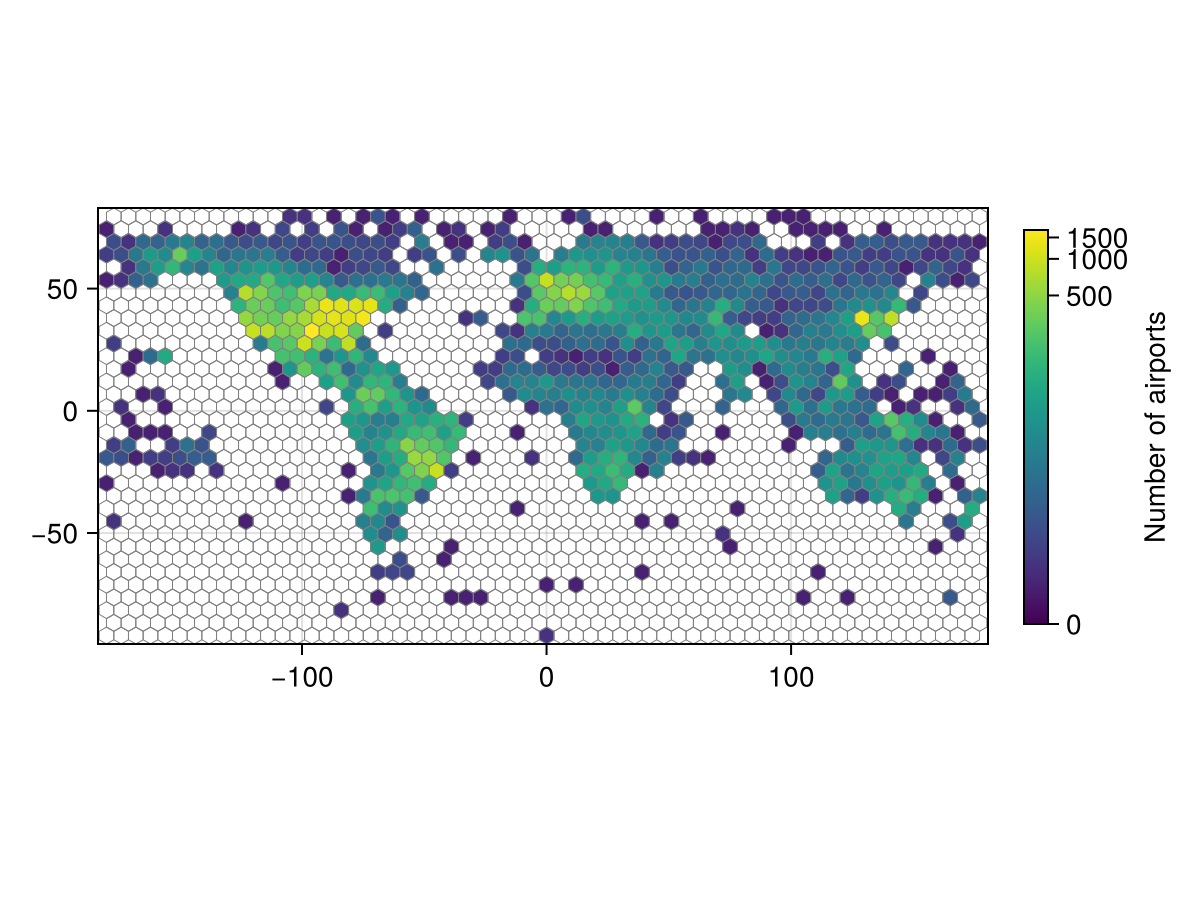 hexbin(xs, ys; kwargs...)Plots a heatmap with hexagonal bins for the observations xs and ys.