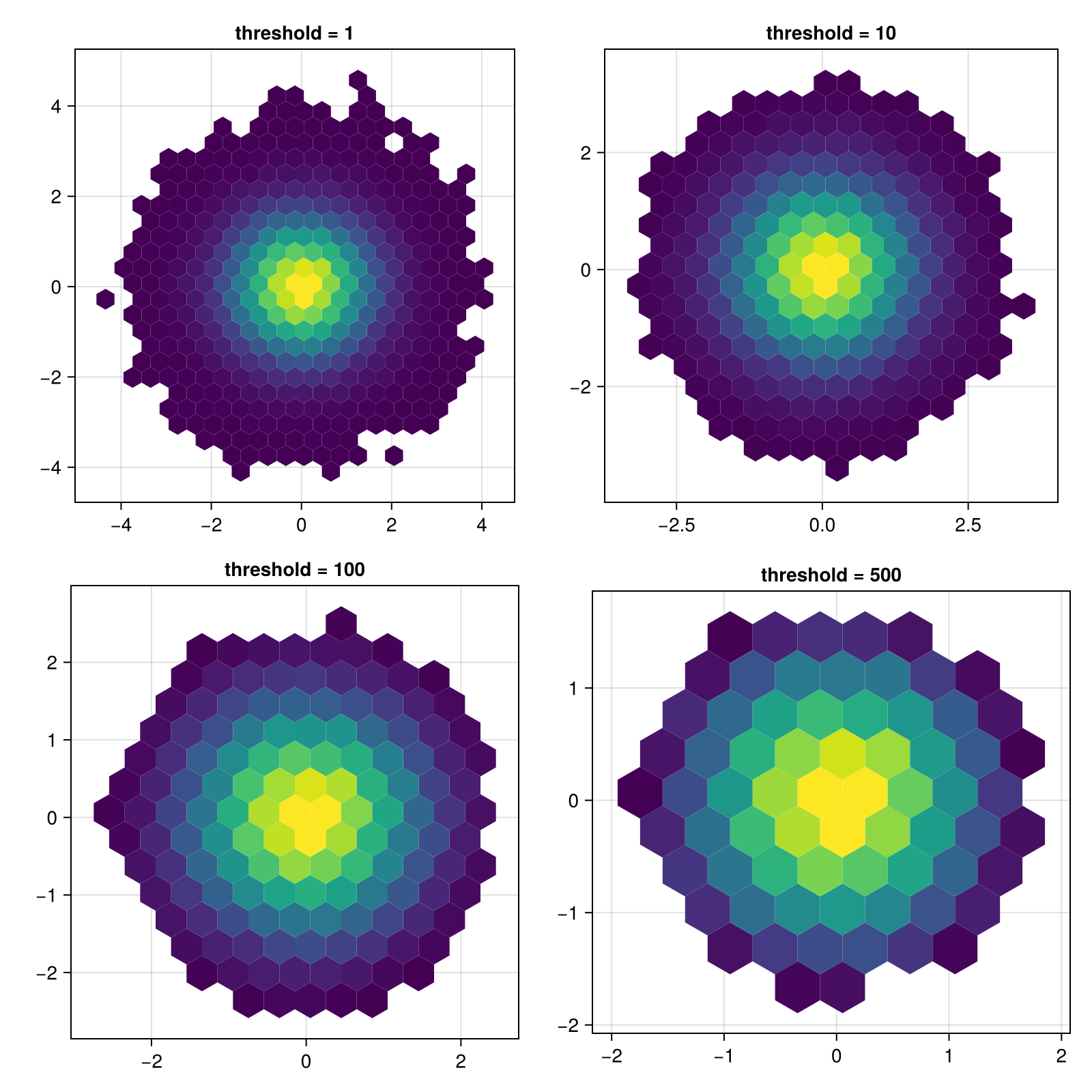 hexbin!(ax, x, y, cellsize = 0.4, threshold = threshold)