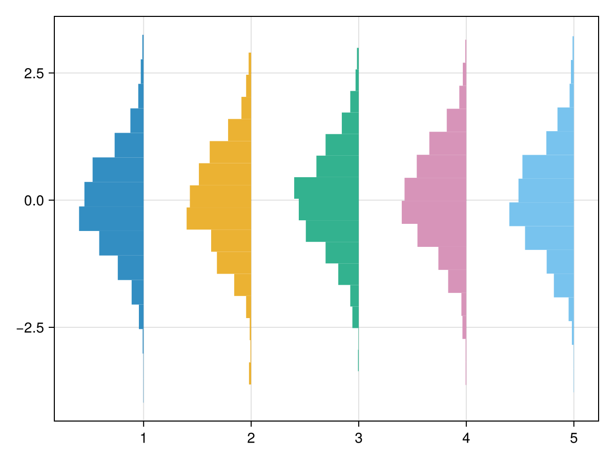 hist!(ax, randn(1000), scale_to=-0.6, offset=i, direction=:x)
