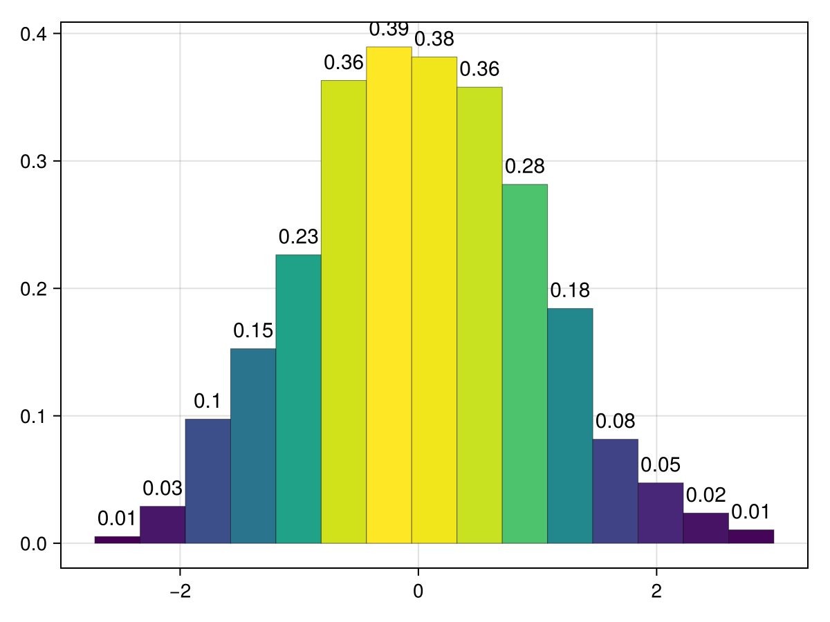 hist(data, normalization = :pdf, bar_labels = :values,