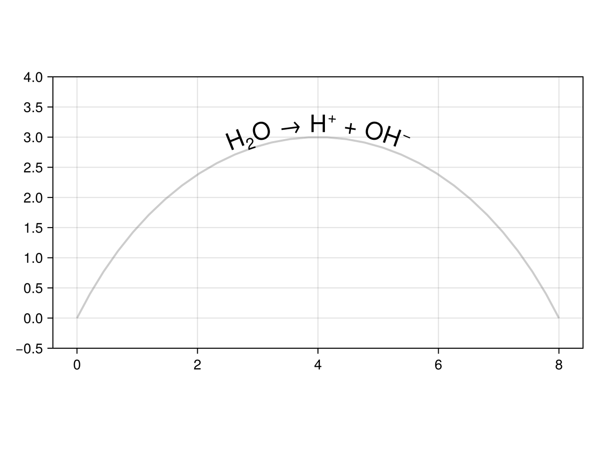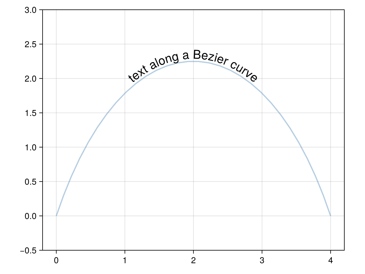 pathtext(path; text = "", kwargs...)Draw text along a path. path can be a Vector{<: Point2} (with optional NaN separators between sub-paths) or a BezierPath.