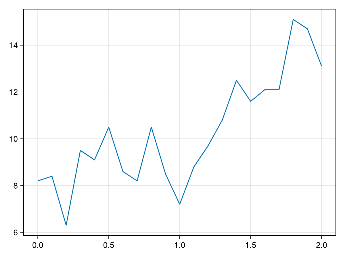 8.8, 9.7, 10.8, 12.5, 11.6, 12.1, 12.1, 15.1, 14.7, 13.1]Let's have a first look at this data as a line plot. Line plots are created with the lines function in Makie.