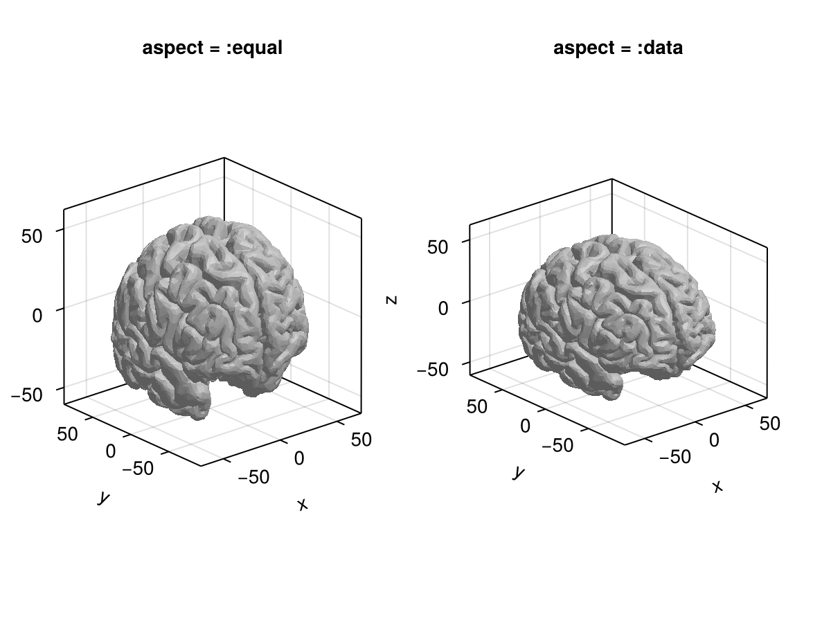 :datawhich sets the length ratios equal to the limit ratios of the axes. This results in an "unsquished" look where a cube in data space looks like a cube and not a cuboid.:equalwhich is a shorthand for(1, 1, 1)