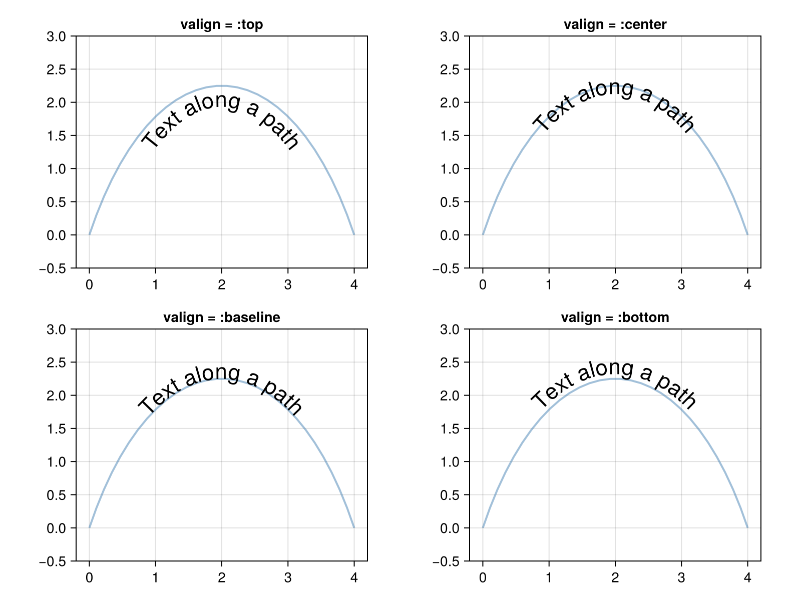pathtext(path; text = "", kwargs...)Draw text along a path. path can be a Vector{<: Point2} (with optional NaN separators between sub-paths) or a BezierPath.