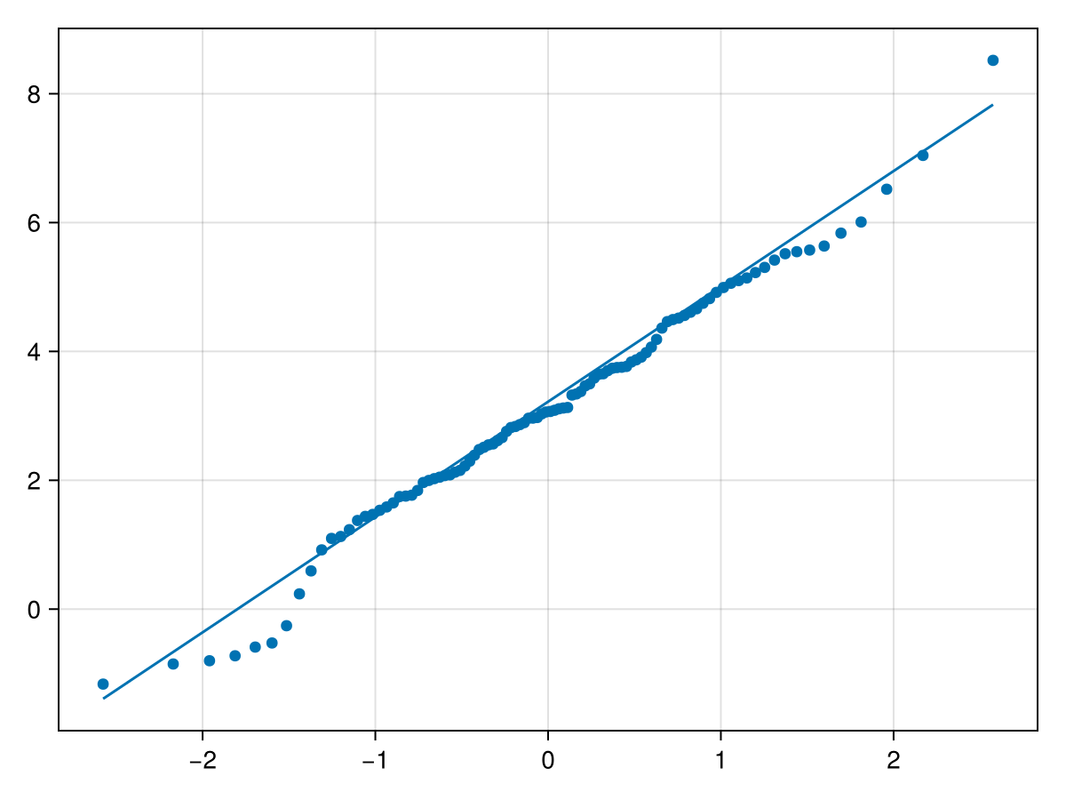 qqnorm(y; kwargs...)Shorthand for qqplot(Normal(0,1), y), i.e., draw a Q-Q plot of y against the standard normal distribution. See qqplot for more details.