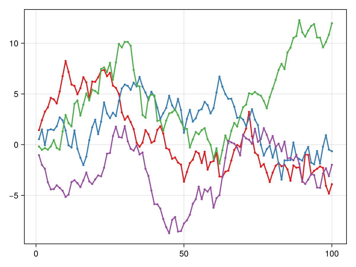 pointvectors = [Point2f.(1:100, cumsum(randn(100))) for i in 1:4]