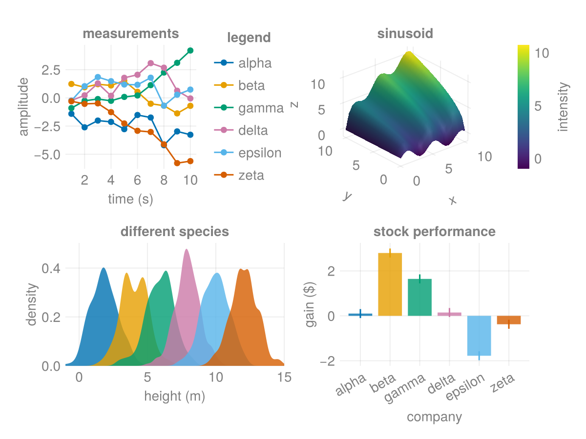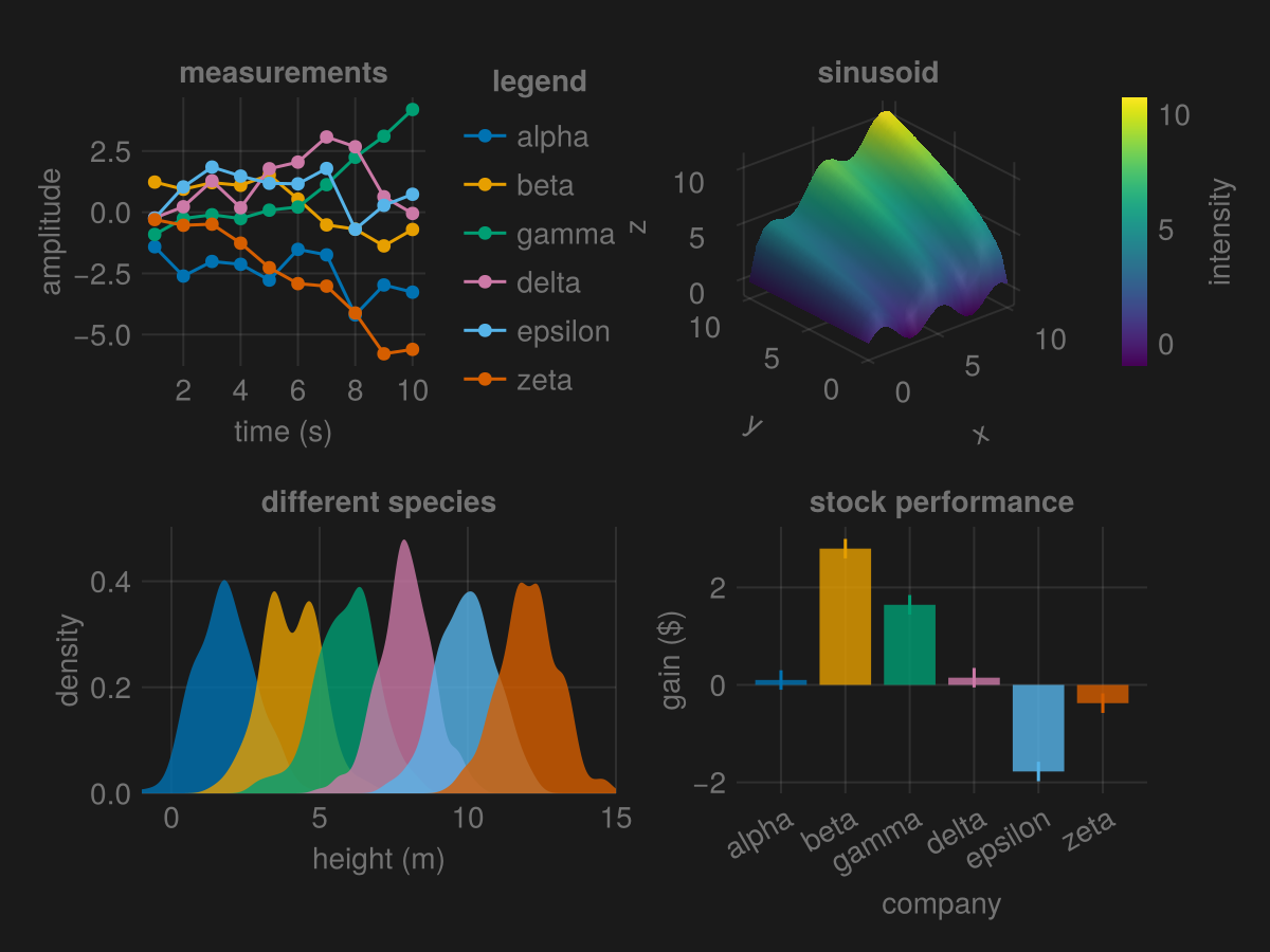Makie has a few predefined themes. Here you can see the same example figure with these different themes applied.