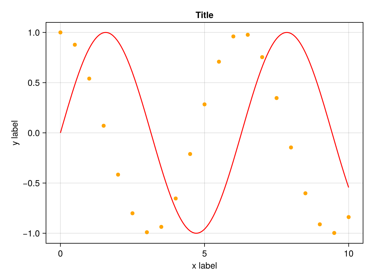 scatobject = scatter!(0:0.5:10, cos, color = :orange)