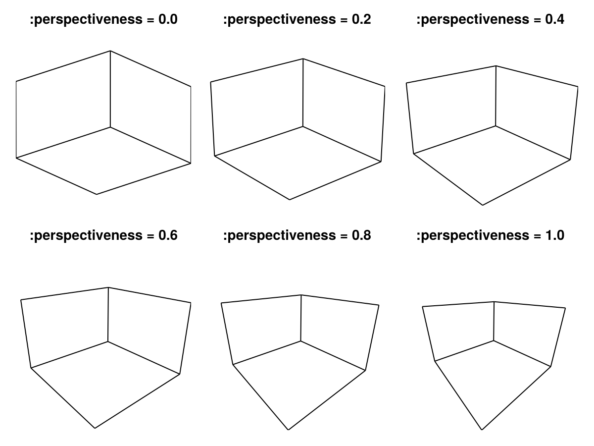 This setting offers a simple scale from 0 to 1, where 0 looks like an orthographic projection (no perspective) and 1 is a strong perspective look. For most data visualization applications, perspective should be avoided because it makes interpreting the data correctly harder. It can be of use, however, if aesthetics are more important than neutral presentation.