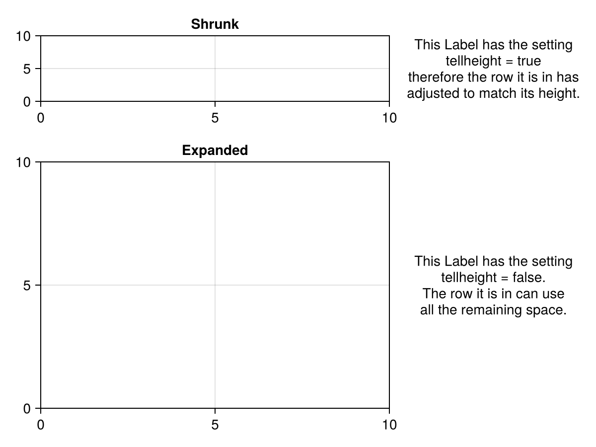 Label(f[1, 2], "This Label has the setting\ntellheight = true\ntherefore the row it is in has\nadjusted to match its height.", tellheight = true)