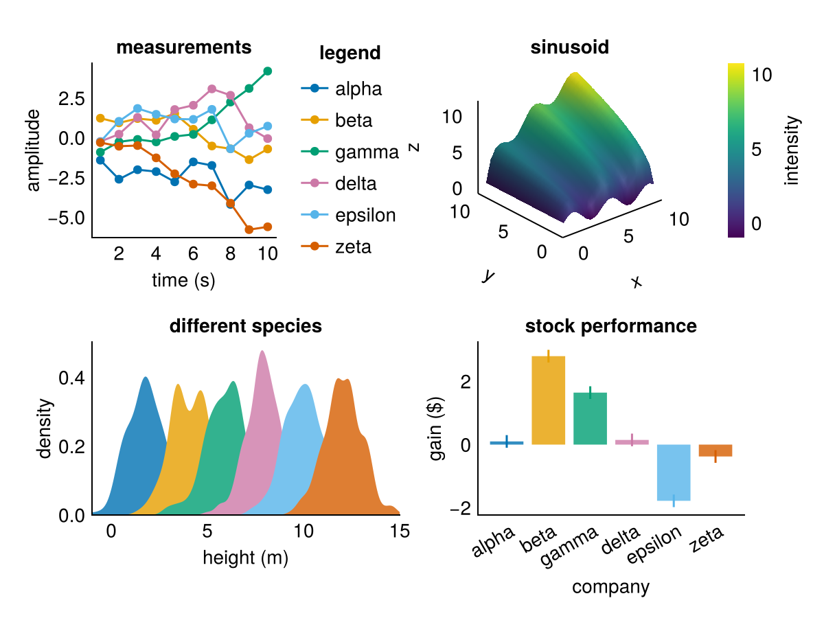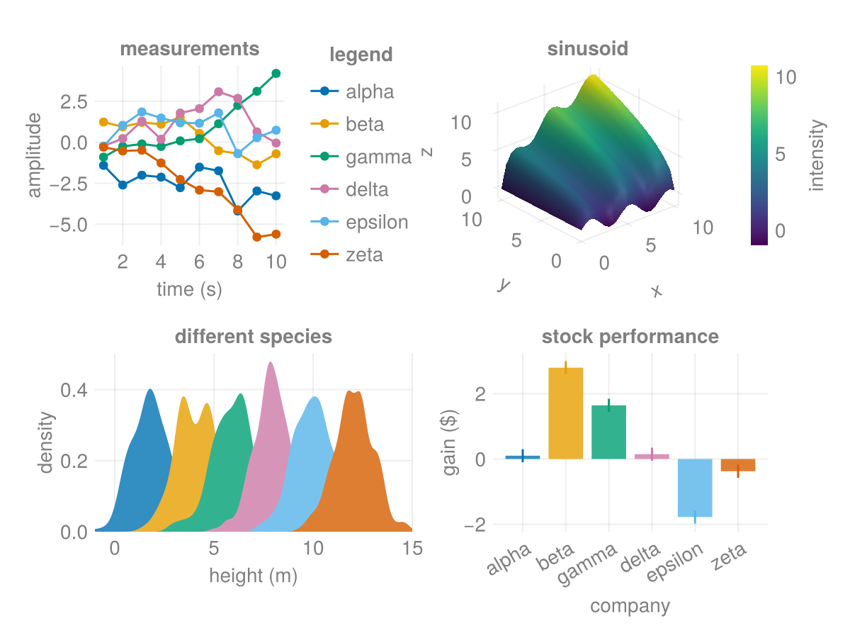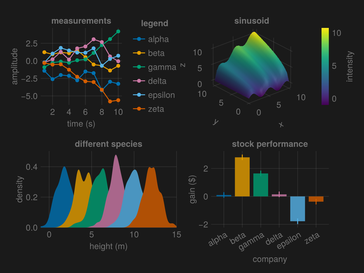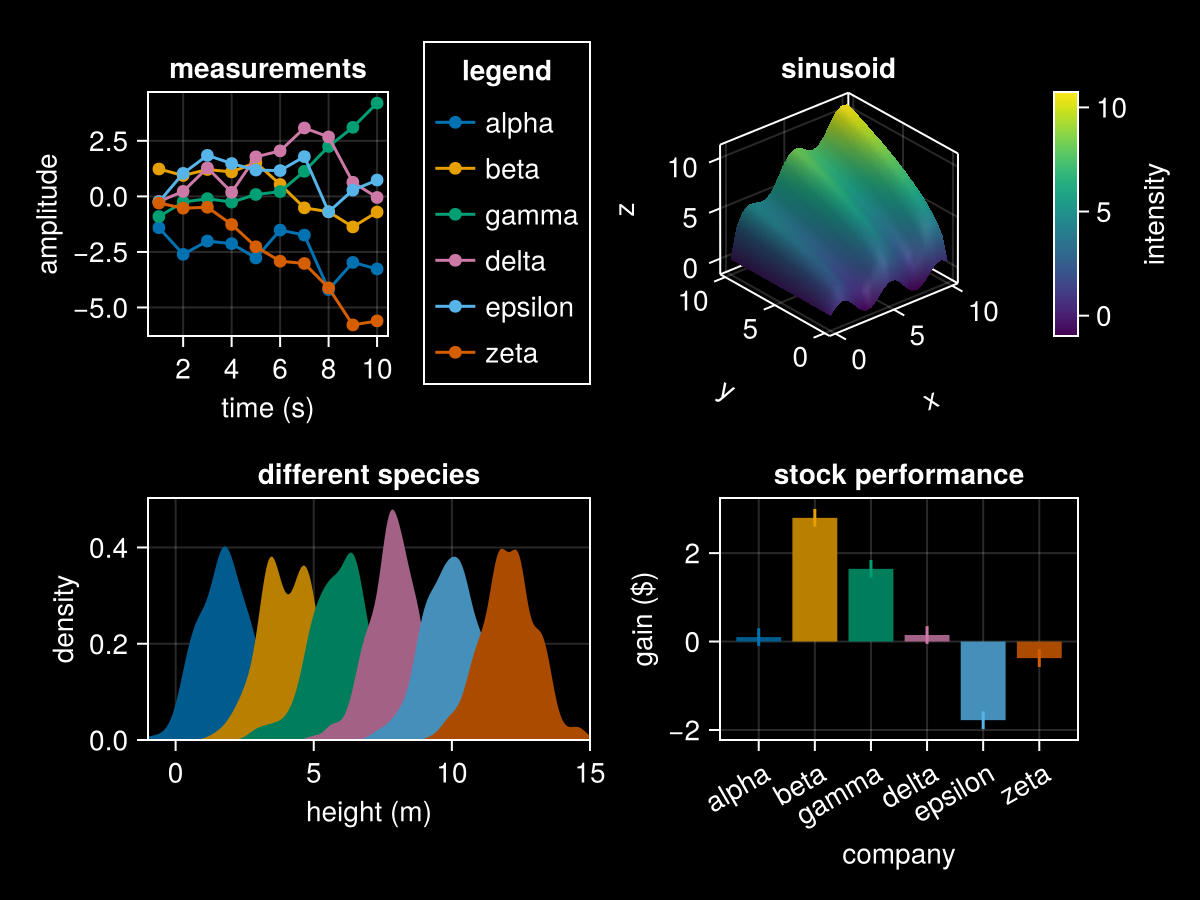 Makie has a few predefined themes. Here you can see the same example figure with these different themes applied.