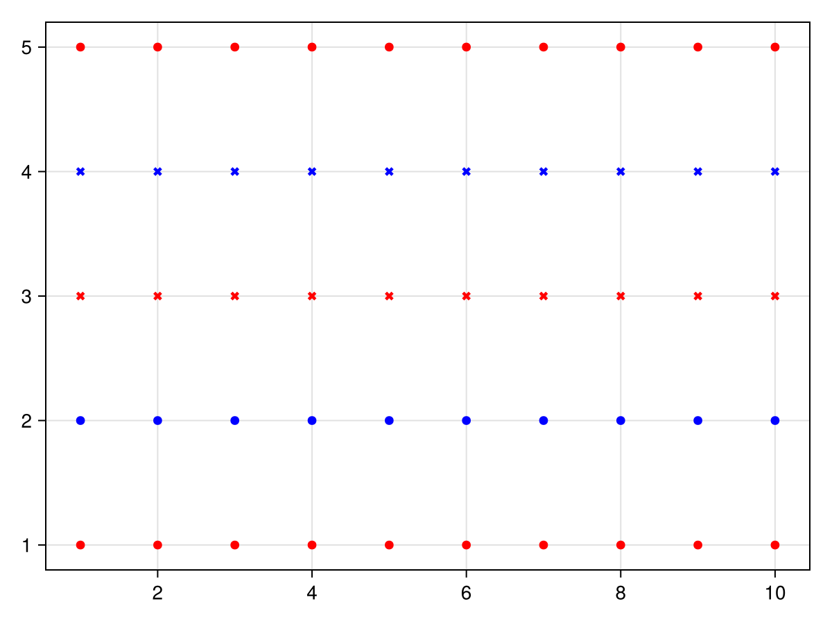 palette = (color = [:red, :blue], marker = [:circle, :xcross]),