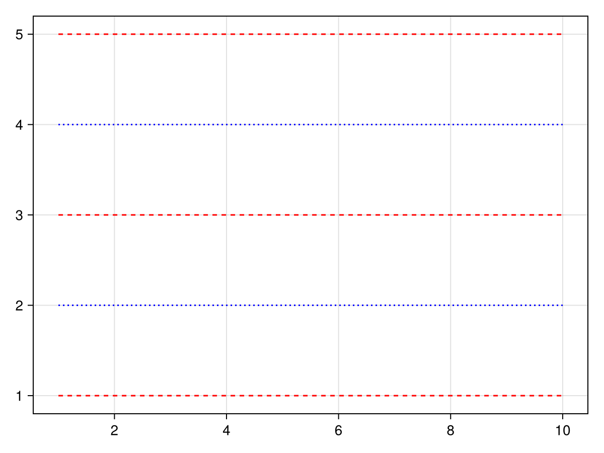 palette = (color = [:red, :blue], linestyle = [:dash, :dot]),