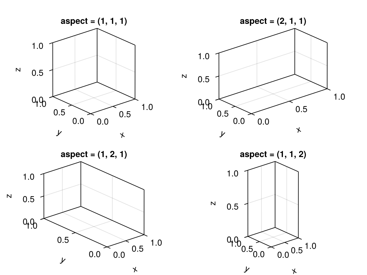 Axis3(fig[2, 1], aspect = (1, 2, 1), title = "aspect = (1, 2, 1)")
