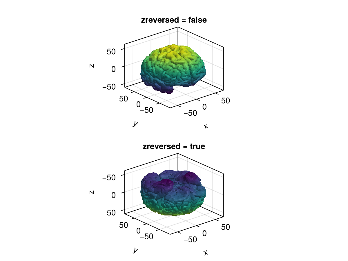 ax2 = Axis3(fig[2, 1], title = "zreversed = true", zreversed = true)