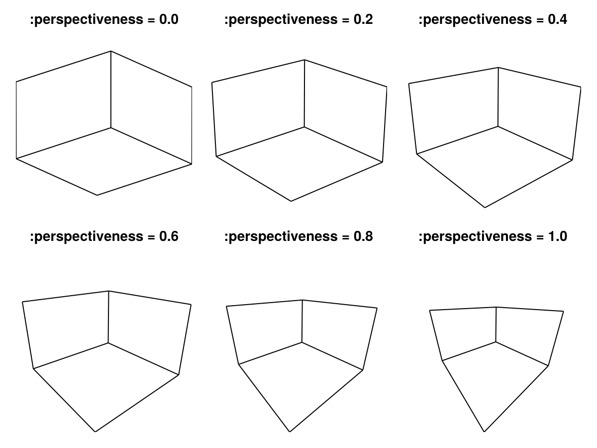 This setting offers a simple scale from 0 to 1, where 0 looks like an orthographic projection (no perspective) and 1 is a strong perspective look. For most data visualization applications, perspective should be avoided because it makes interpreting the data correctly harder. It can be of use, however, if aesthetics are more important than neutral presentation.