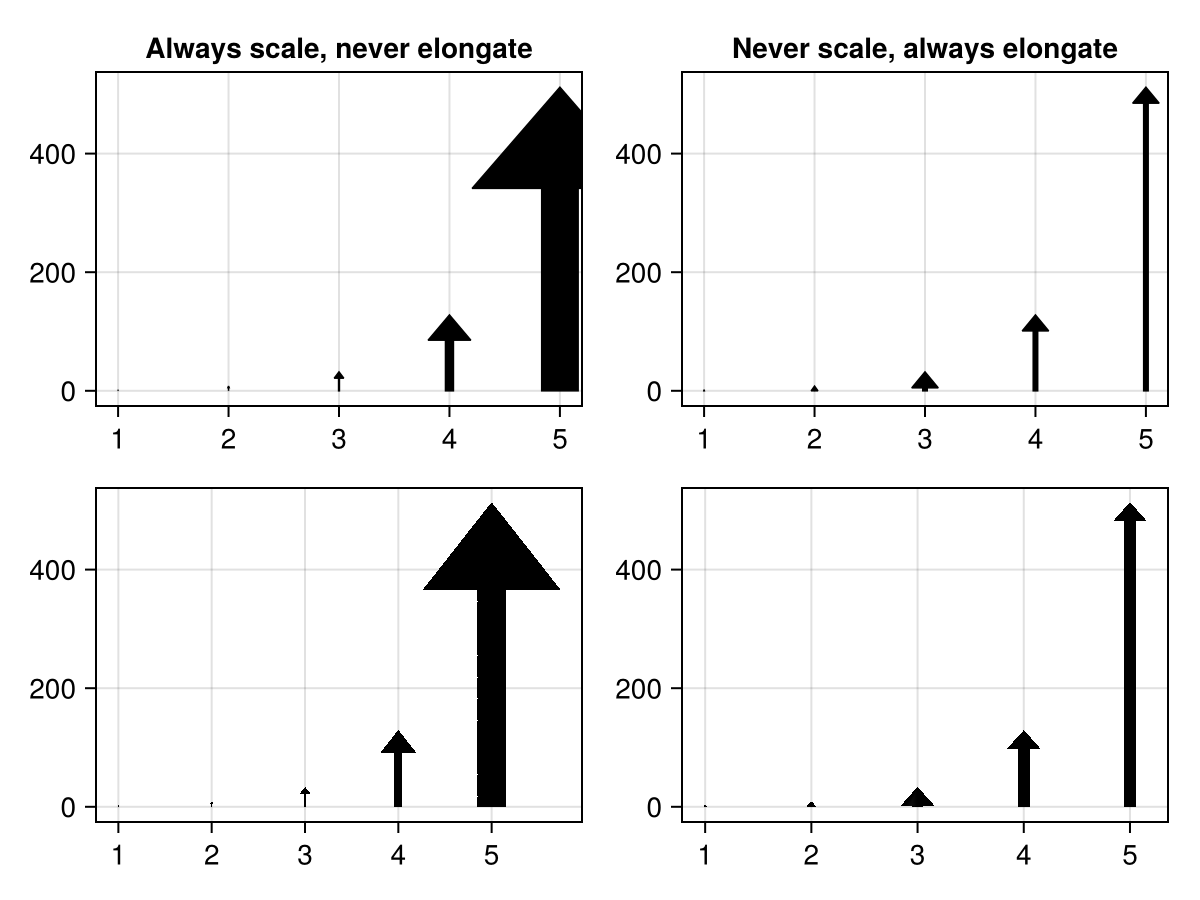 Arrow markers are separated into 3 components, a tail, a shaft and a tip. Each component comes with a length and width/radius (2D/3D) which determines its size. In 2D the sizes are given in pixel units by default (dependent on markerspace). In 3D they are given in relative units if markerscale = automatic (default) or data space units scaled by markerscale otherwise. To fit arrows to the length determined by directions, lengthscale and normalize, the shaftlength varies between minshaftlength and maxshaftlength if it is not explicitly set. Outside of this range or if it is explicitly set, all arrow lengths and widths/radii are scaled by a common factor instead.