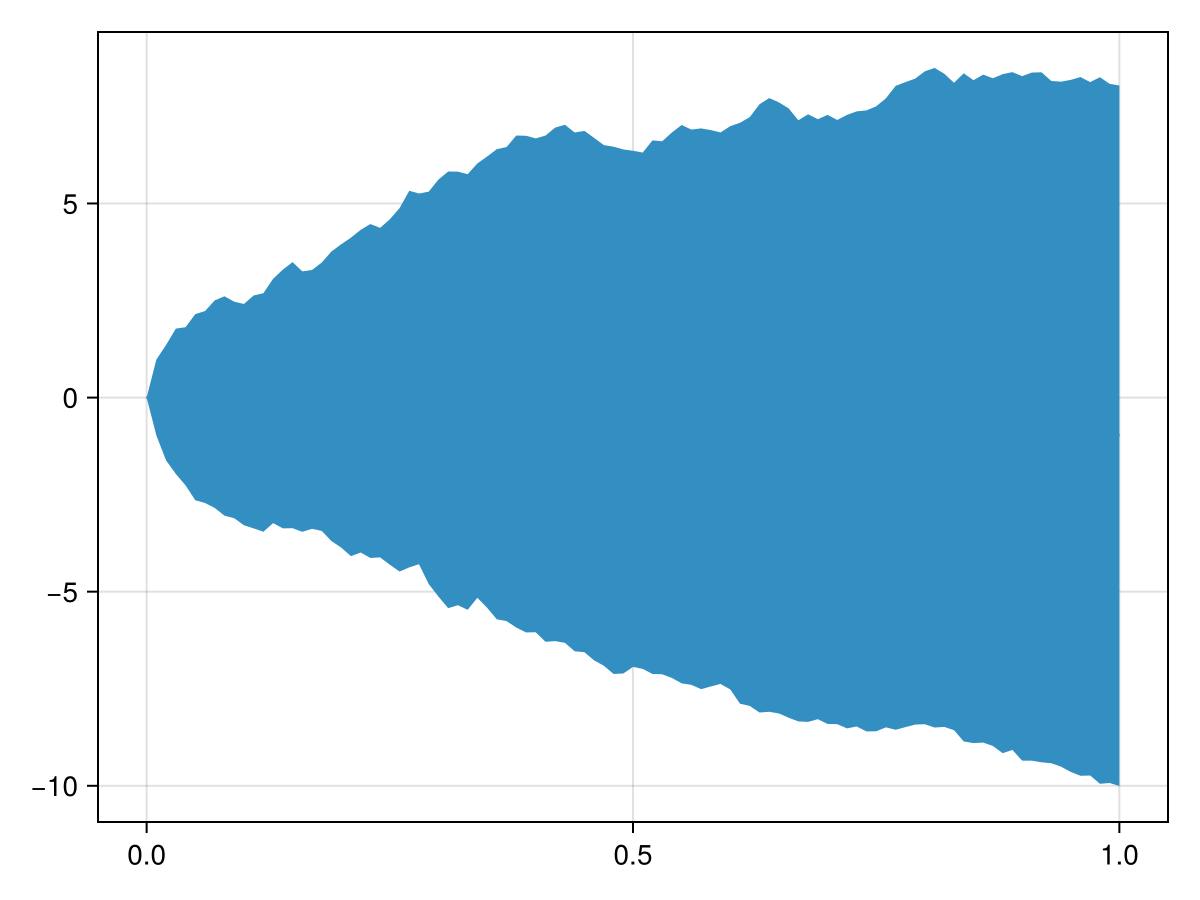 band!(t, μ + σ, μ - σ) # plot stddev band