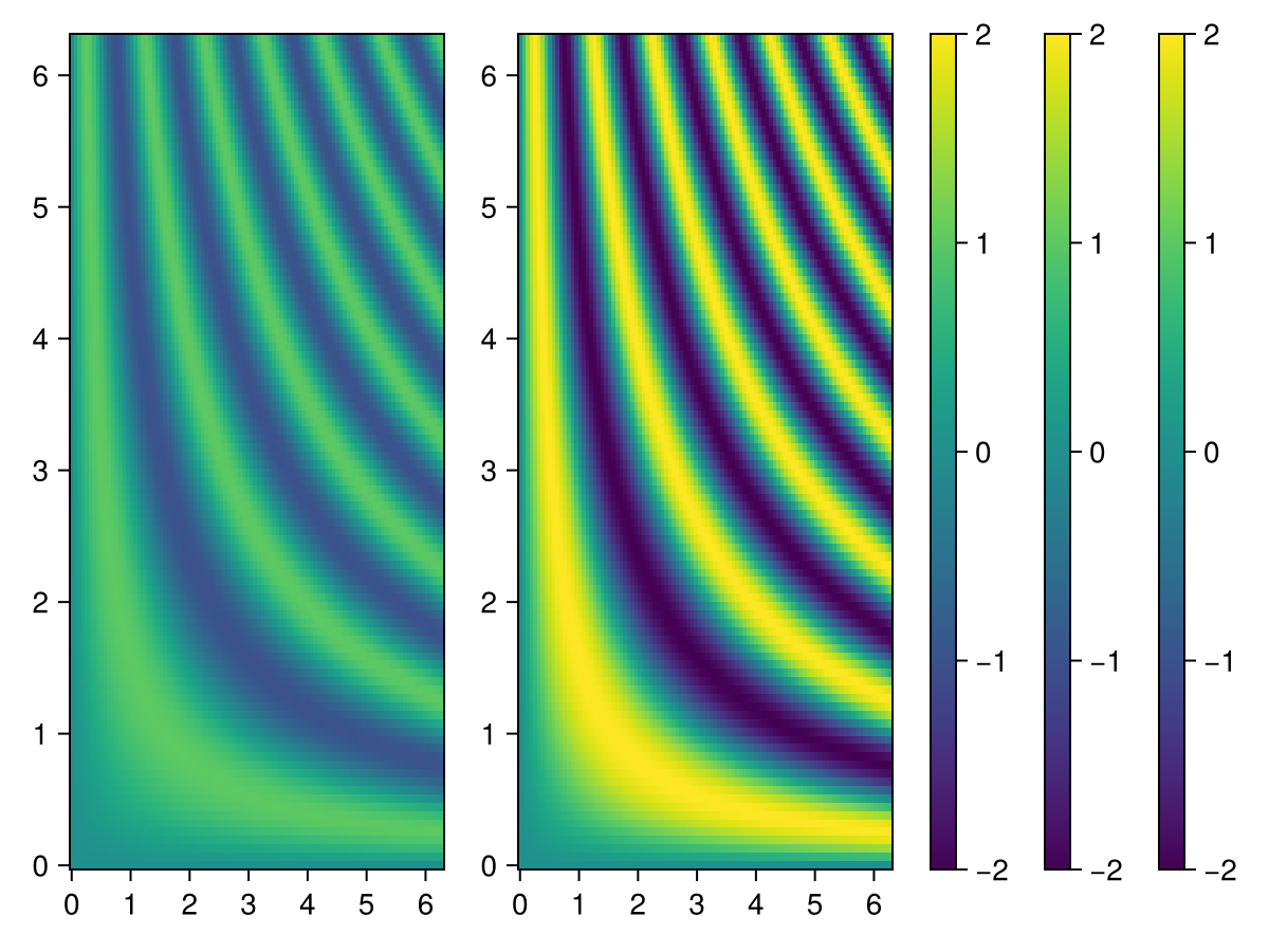 Since the heatmaps in the example below have the same colorrange and colormap, any of them can be passed to Colorbar to give the colorbar the same attributes. Alternatively, the colorbar attributes can be set explicitly.