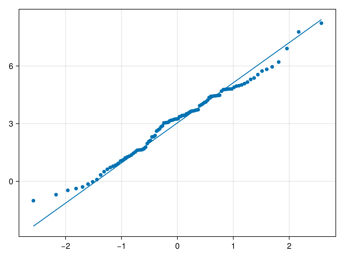 qqnorm(y; kwargs...)Shorthand for qqplot(Normal(0,1), y), i.e., draw a Q-Q plot of y against the standard normal distribution. See qqplot for more details.