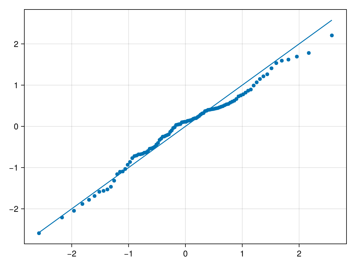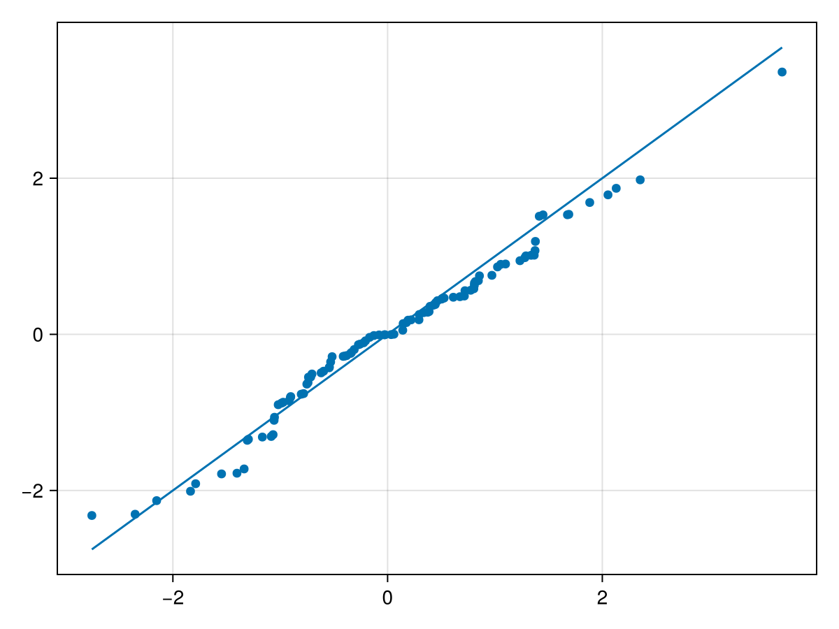 qqplot(xs, distribution = Normal(0, 1), qqline = :identity)