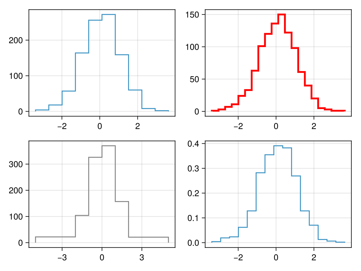 stephist(f[1, 2], data, bins = 20, color = :red, linewidth = 3)